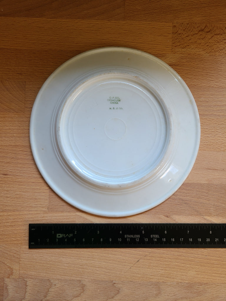 A good example of an dinner plate found onboard Great Northern Pacific Line vessels from 1900-1915. Marked OP Co Syracuse China, MS & Co. 7 1/2" across.