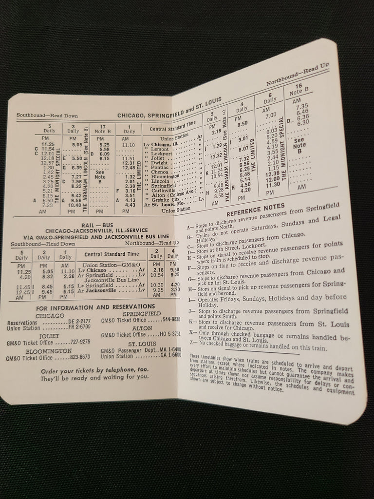 A good example of a Gulf Mobile & Ohio Pocket Timetable for their Chicago to St. Louis route.