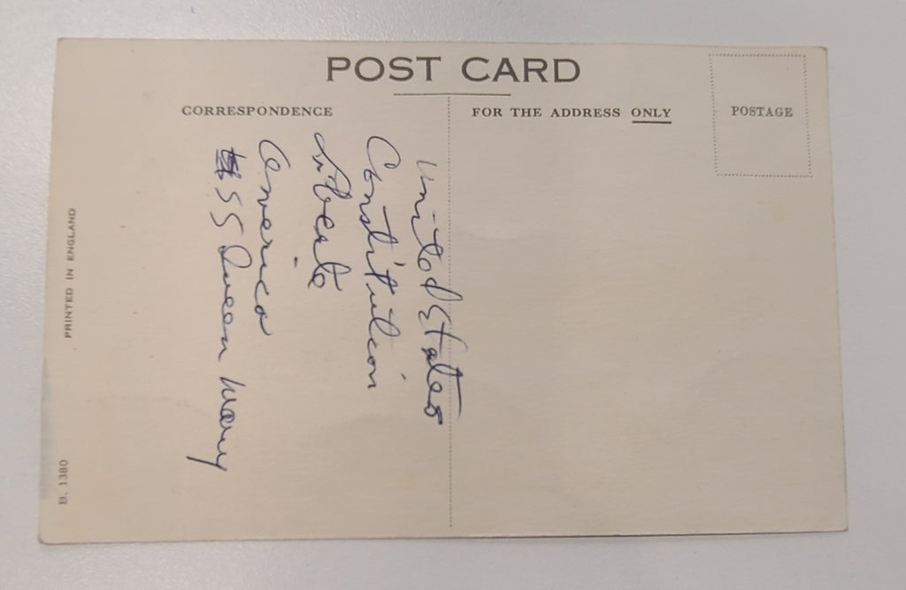 An original postcard depicting the R.M.S. Queen Mary of the Cunard Line. Date Range: 1940s+