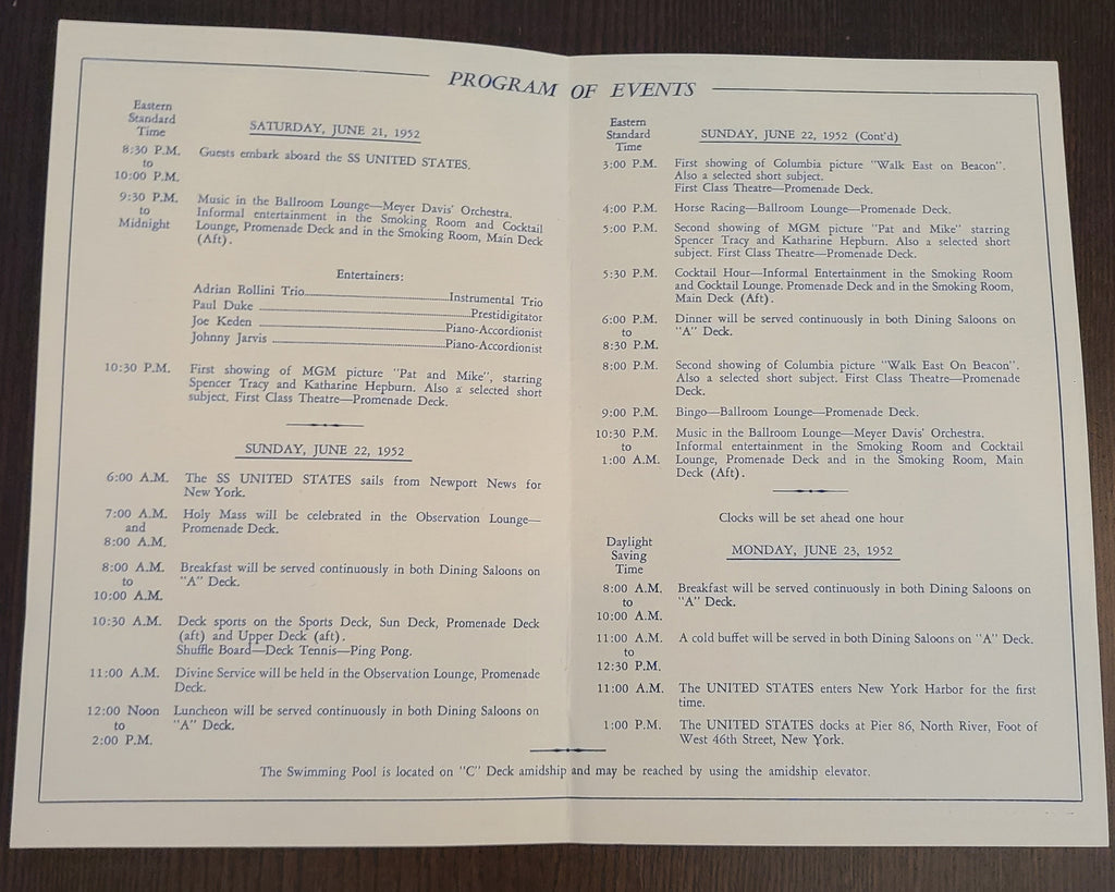 S.S. United States Pre-Maiden Voyage Program of Events (June 21st, 1952)