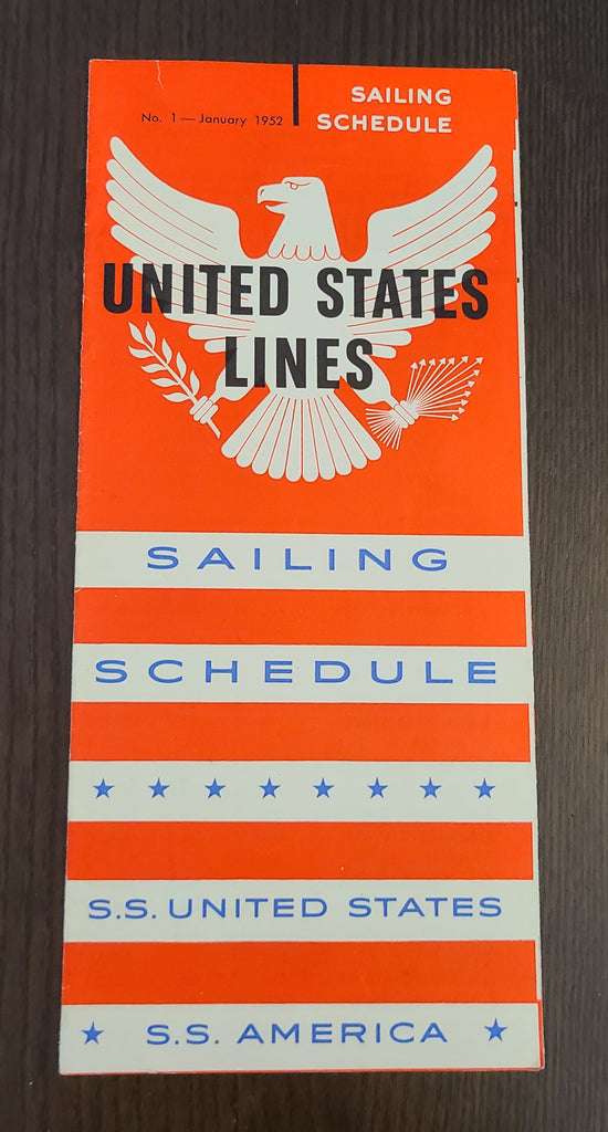 A timetable for the United States Lines, depicting the Sailing Schedules for the S.S. United States and S.S. America. Dated January 1st, 1952.